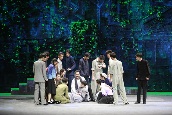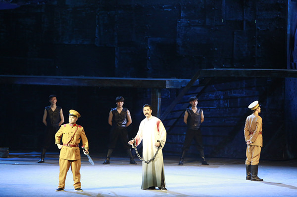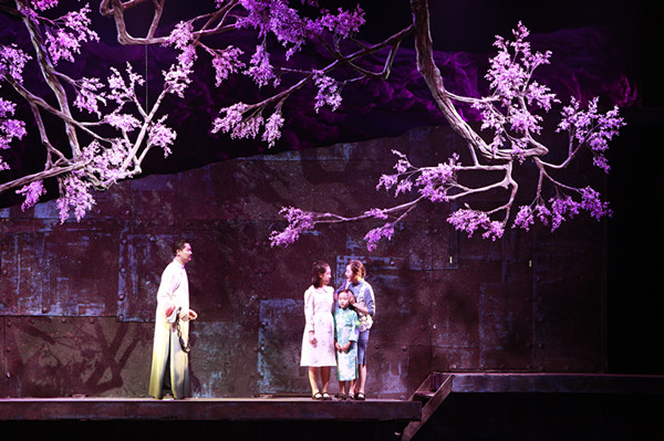 主演蔡鹏对大钊先生的诠释非常到位,演出时也在情感处理上融入很多细节。在第一幕“刑场转机”中,大钊先生在北大校园里和同学们一齐念诵《青春》片段,众人语调抑扬顿挫,慷慨激昂,充分展现了北大师生的家国情怀和青春活力。第二幕“审判”中大钊先生与妻女的对唱更是感人至深。当赵纫兰被当作威胁大钊先生的武器,从审判室里放进来的时候,所有的一切仿佛静止:他的兰姐,孩子们的母亲!舞台上方的丁香树缓缓落下,过往的温馨与现实的残酷形成鲜明对比。兰姐的扮演者喻越越的歌声如泣如诉,缠绵悲戚,虽带有万分不舍,依旧表达了对丈夫的理解和肯定,一个柔弱却坚强的女子形象被刻画得淋漓尽致。