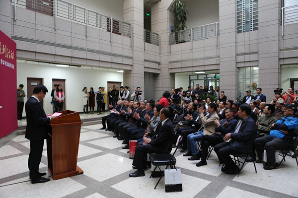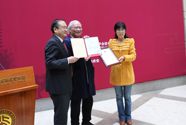当日,兰亭书会现任会长谢有才老先生也亲临开幕式现场,并向北大图书馆和会议中心赠送作品,会议中心张胜群主任向谢老赠送了收藏证书。