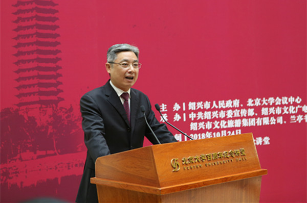 开幕式上,首先由绍兴市政协副主席冯建荣致辞。冯建荣先生指出,千百年来从绍兴这座古城走出了大禹、王羲之、陆游、秋瑾、蔡元培、鲁迅等一大批杰出历史文化名人,他们的丰功伟绩与浩然之气极大地振奋了民族精神。而传承百年的地方戏曲越剧和绍剧,二者一柔一刚,犹如一阴一阳, 构成了当地特有的越乡文化,也构成了这座古城最具代表性的文化符号。本次活动展示的内容充分展现了绍兴戏曲之乡、书法之乡、名士之乡的底蕴特色,为促进千年古城和北大这所中国最高学府进一步交流合作打开了更为广阔的空间。
