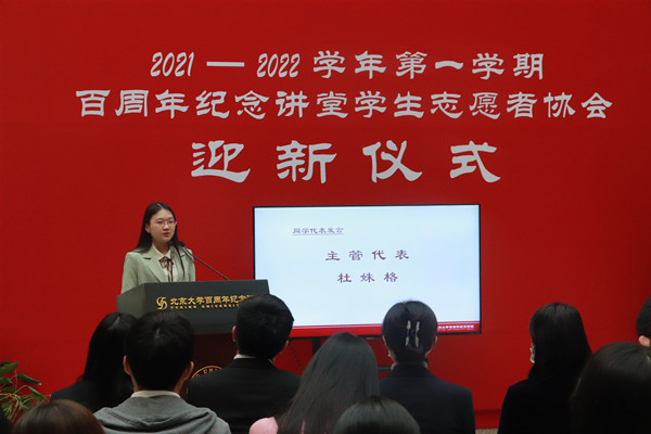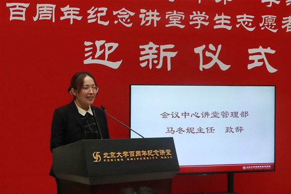 讲堂管理部马冬妮主任发表迎新致辞。作为大家的学姐和志愿者前辈,马主任首先对新志愿者的加入表示热烈欢迎,并对志愿者的默默奉献和认真敬业表达了感谢。马主任从个人成长与讲堂使命两方面谈了志愿者工作。她表示,志愿工作有利于磨炼成熟稳定的心态,坚韧谦逊、互谅热心的优秀品质,培养严谨专业高效的工作能力,这将对个人的成长成才大有裨益。二十余年来,讲堂志愿者团队与讲堂同步成长,讲堂未来工作将围绕美育和德育两个基本点,更紧密地与各院系合作,把工作和学生思政教育全面结合。马主任鼓励志愿者发挥更多智慧和活力,提供自己的创造、意见和建议,在丰富的工作内容中发挥更大的价值。