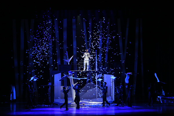 首先是白色的道具设计。忠于原著的白鹰、白马和白色百合花,舞台背景中白色树干、白色悬崖,以及根鸟白色风格的穿着,无不能看出剧组对白色的执着。白色是灵活的,随着灯光的不同而展现出多样的色彩。或许,根鸟的白色西服,象征着他踏上旅程时洁白无暇的心灵,而变换着的灯光,则是旅途中的种种经历,根鸟白衣的色彩在不停改变,意即他的内心在不断成长、不断受到外界的影响。但白色始终是白色,五彩的光芒散去时,那抹白色依然是那么纯粹。或许剧组想借此,在北京大学120周年校庆之际,告诉每一位观众,愿你们历经沉浮,归来之时,还是那位纯白无暇、痴心追梦的少年。