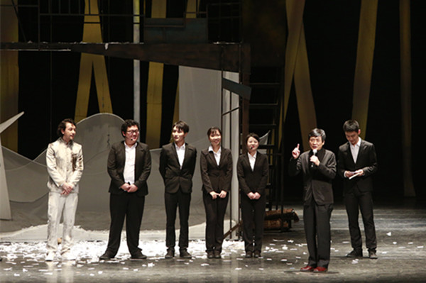 北大教授曹文轩(右二)在观看首演后与观众交流