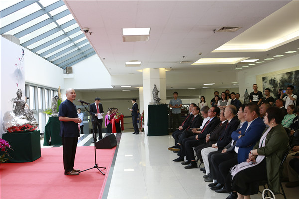 许先生情真意切的致辞博得了现场热烈掌声。随后,到场的领导嘉宾与艺术家共同上台,为本次展览开幕剪彩。许文融将自己的代表作品《心外无法》雕塑赠予讲堂。赠送仪式上,许文融谈及自己的创作心得,他以东方思维来创作“东方化的雕塑”,这件作品便是将草书形式的《般若波罗蜜多心经》制成。草书流畅连绵的线条塑造出一尊佛像造型的镂空雕塑,令人赞叹不已。除这件作品以外,“草书”雕塑系列还有二十余件作品,都是以中华文化的经典为主题,将三维空间的雕塑与二维平面的书法相结合,别出心裁、寓意深远。这一系列的雕塑作品制作工艺复杂、耗时极长,在长达十五年的创作中仅有二十余件。本次来到讲堂展出的便有多件,是展览中不容错过的亮点。会议中心张胜群主任为许文融先生赠送收藏证书,对许先生表示感谢。