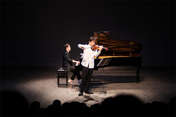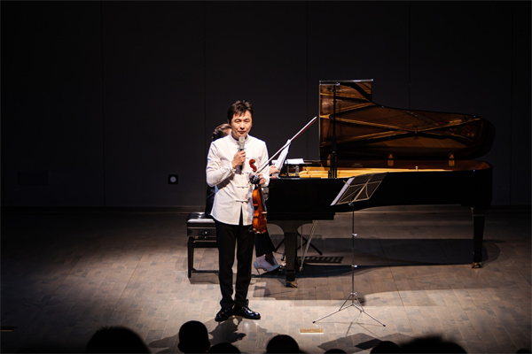 10月26日晚,马思聪经典小提琴音乐会在百周年纪念讲堂李莹厅上演。小提琴演奏家张精冶携手作曲家周静共同演绎了著名小提琴家马思聪的经典小提琴作品。马思聪是中国第一代小提琴音乐作曲家与演奏家、音乐教育家。他将民族风格、演奏技巧和西方音乐手法融于一体,是中国近代较早运用西洋音乐技法创作的音乐家之一。本场音乐会以充满力量的《西藏音诗》(1941)拉开序幕,带领观众走进了马思聪先生所创作的音乐世界。优美的《阿美组曲》(1973)、抑扬顿挫的《绥远组曲》(1937)、欢快激昂的《牧歌》(1944)……这些或温柔细腻、或激情澎湃的乐声中,既彰显了马思聪先生卓越的作曲能力,也体现了两位音乐家技艺的高超。演出间隙,张精冶对演奏曲目进行了导赏,深入浅出地介绍了马思聪先生作品的创作特点,并表示“音乐无国界”,呼吁大家广泛了解音乐,希望大家都能找寻到自己喜欢的音乐。本场音乐会让师生观众们感受到了马思聪小提琴作品的音乐特点,领略到了中国小提琴音乐的魅力与风情。