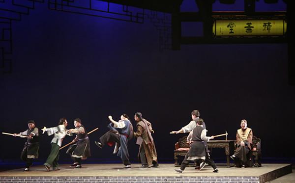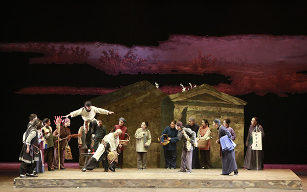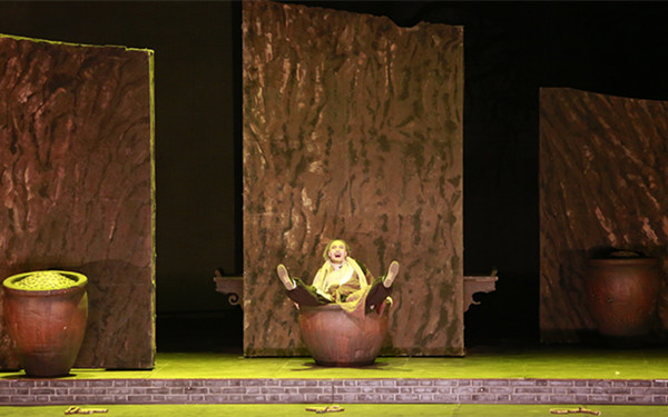 《武训先生》整个本子清新干净,没有高雅的诗词和诘绌的字眼,白话唱词极为质朴,朗朗上口,看似未经雕琢,却兼具文学韵味与生活气息。梨花树下,田野垄旁,武训和梨花逗趣跑闹,互表心意,那种欲说还休的青涩和美好,让观众不禁莞尔。剧本简洁也就决定了简洁的舞台呈现方式,一个转台,可成梨花林,可成张家客堂,也可成集市、破庙、地窖、学堂,一个敞开的写意空间,给了演员们极大的表演可能性。