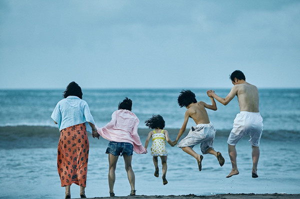 《小偷家族》的电影语言值得称道。片头明快音乐下对于父与子偷盗场景的长镜头剪辑,似乎就奠定了本片对于道德边界的模糊态度的基调;多次出现的门缝视角,勾勒出友里进入家庭的不适应感;从小黑鱼故事的隐喻,到母亲与友里多次交流以及熨斗伤痕的巧合,电影快速让观众接受了小偷家族的其乐融融,而又设置细节为后来的分崩离析埋下伏笔。是枝裕和对于生老病死的平淡刻画再一次得到体现,小女孩的掉牙暗示着奶奶的悄然离去,死去的时候“家人”甚至为了利益而放弃求助救护车和安排一次体面的葬礼。是枝裕和再次给我们带来了他所擅长描绘的“小确丧”,纵然《小偷家族》里有戏剧性的起承转合,导演却刻意弱化这种主观情绪,每当观众感受到美好时,导演就会冷酷地把我们拉回现实,对于悲剧性情节却又不大肆渲染。一家人看烟花时的广角俯拍镜头,一片祥和中背景音乐却显得沉重,果然下一幕就带来了“诱拐”这一话题的争论;一起在海边久违地享受生活,打趣说笑,海滩旁五人的背影却似乎暗示着下一幕奶奶的离去。
