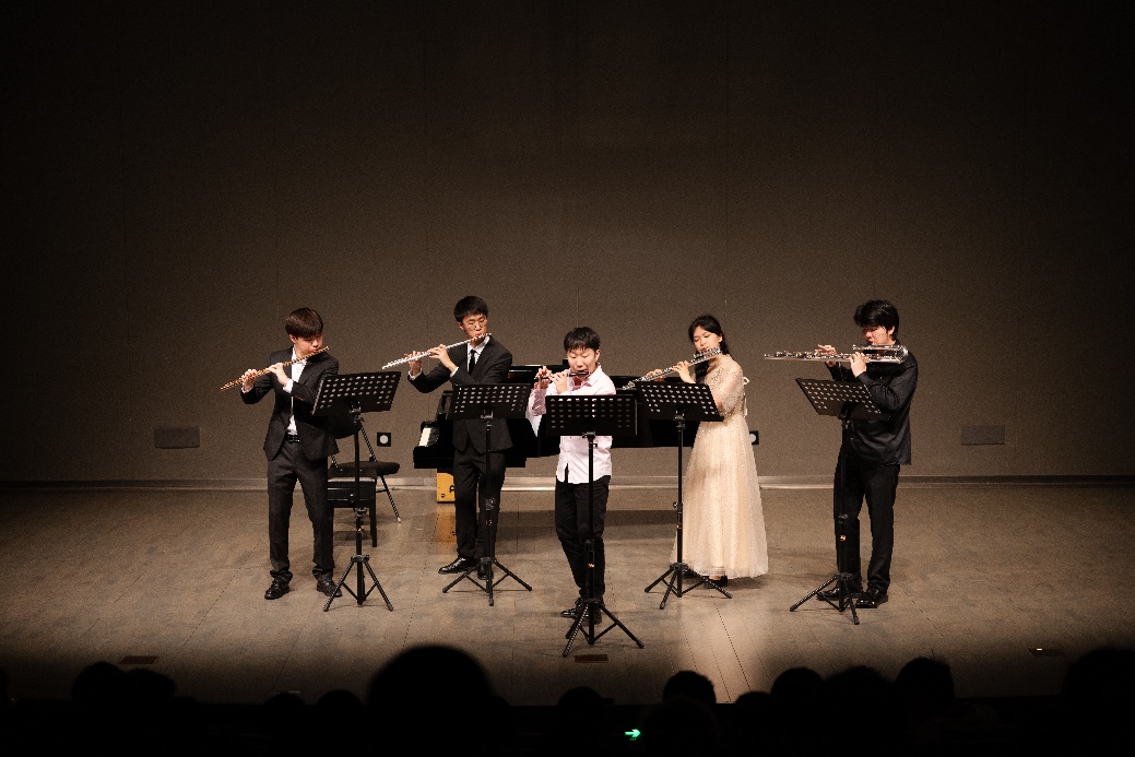 除了长笛独奏与重奏作品外,音乐会不少曲目长笛、短笛分声部组成乐队,吹奏立体丰富的和声色彩,乐音充满灵动与仙气,让整个李莹厅沉浸在美妙欢愉的气氛中。最令人印象深刻的无疑是最后盛大的长笛合奏,选取Fly Me to the Moon、Another Day of Sun作为演出的句点。浪漫的曲调谱写情感的五线谱,前者作为第一首登上航天飞行器在宇宙播放旋律的乐曲,它不仅仅是一部情感史诗,更是被赋予了人类对音乐的崇高追求。后者被赋予梦想与爱情的曲目也同样经典,同学们手拿沙锤手鼓,让熟悉的旋律更添欢乐灵动,一起颂唱对音乐的赞歌。轻柔悠扬、隽永高雅的长笛音色成为本场演出贯穿始终的元素,开启了当晚奇妙的音乐之旅,叩响那扇音乐世界的门扉。演奏家们精湛的技术和深刻的音乐表达为北大师生展现了长笛的艺术魅力,带给观众们极高的艺术享受,在全场热烈的掌声中,音乐会落下帷幕。