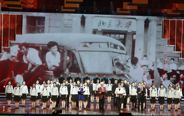 晚会第一篇章“革故鼎新”在《我的一八九八》原创歌舞中开启,“我的未名博雅,我的家国天下”唱出北大青年精神传承与坚定信念。原创音乐剧《大钊先生》再现了以李大钊为代表的北大早期爱国主义师生志士“实现劳苦大众梦想,书写中国新历史”的风采。钢琴四手连弹《保卫黄河》由著名钢琴家郎朗与北大学生合作,奏响民族危亡之际北大学子与祖国共命运的时代最强音;原创诗朗诵《聆听青年》赞颂了“五四”时期以来北大学子为国家、为民族一往无前的使命与担当,他们“想到、说到、做到”,用“永恒的青春汇聚成恢弘的梦想”。教授、校友、学生、附属幼儿园各年龄段合唱团借《新秋之歌》寄托着对青年一代的美好的希冀与祝愿。学生民乐团与港澳台学生代表合奏的《光明行》则表达了两岸四地北大学子满怀对中华民族伟大复兴的无限憧憬,描绘革故鼎新的理想愿景。