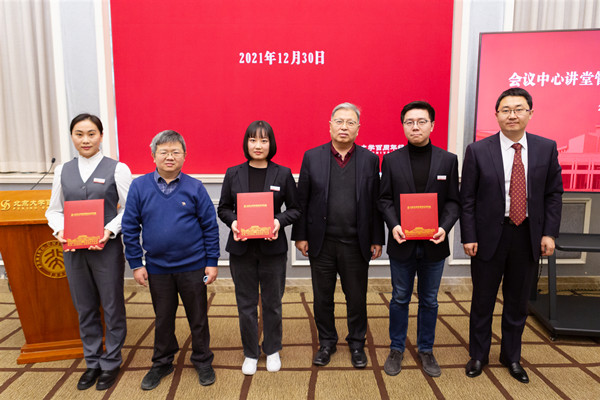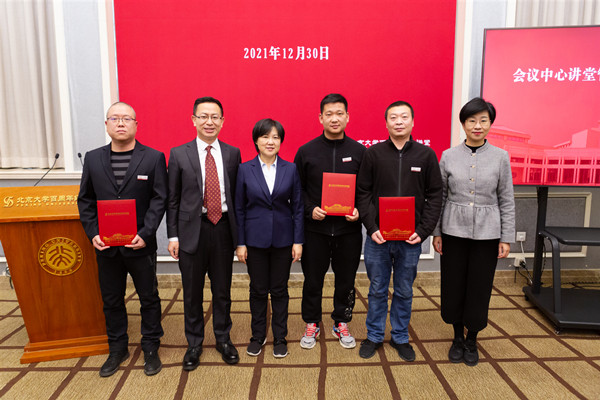 随后,讲堂管理部副主任李春亮宣读了2021年度荣获学校和中心奖项以及获得讲堂先进称号的集体和个人名单,会议中心领导班子为先进集体和个人颁奖。师生服务办公室李宝柱、艺术活动办公室田耕、文创办公室黄丹、运行保障办公室郐凤来四位获奖代表依次发言,分享了各自在2021年的工作心得,展现了讲堂人恪尽职守、勇于探索的工作风貌。