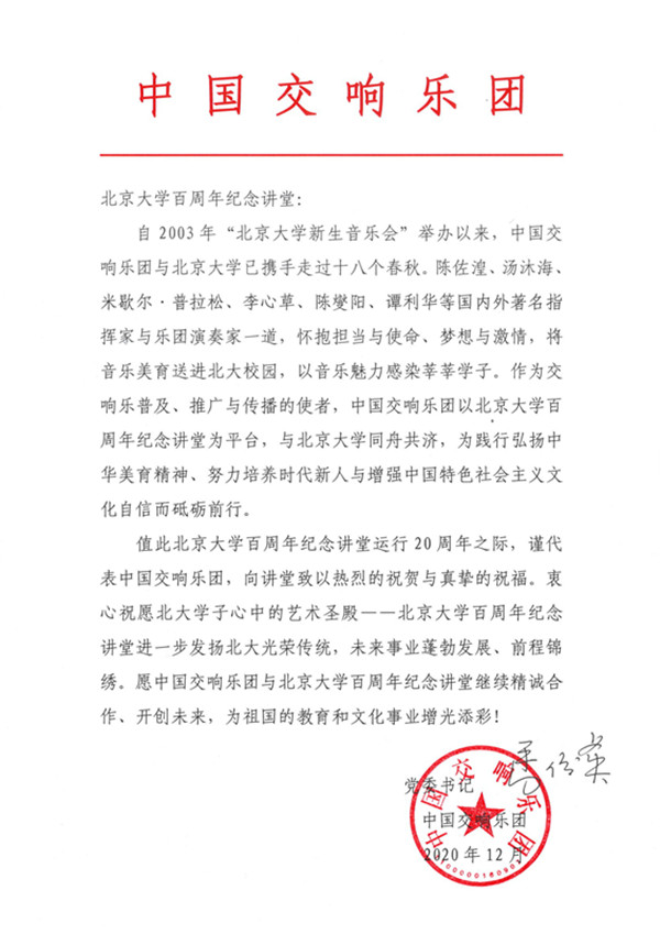 2020年适逢北京大学百周年纪念讲堂运行20周年,二十年来,讲堂与众多艺术家和艺术团体携手,打造出“高雅艺术殿堂”和“素质教育课堂”的双重品牌。