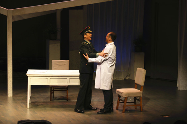 五年过去了,当年的军人因这个二等功升为排长;作家舍去尊严,向上级求来了地震工作的优秀表彰奖;医生依然忙忙碌碌,申请课题,参加会议,为自己镀金。但每个人都不快乐,在五月的夜晚,无边的黑暗中,前尘往事都一一浮于脑海,响于耳畔。适时的音乐烘托了这一氛围,提琴哀伤婉转,和着流水般的钢琴曲在李莹厅缓缓响起,为三位演员精彩的表演增色不少。舞美与配乐以简洁为主,使观众更沉浸于剧情中,随着三位演员一起感受痛苦,寻求心理上的抚慰。