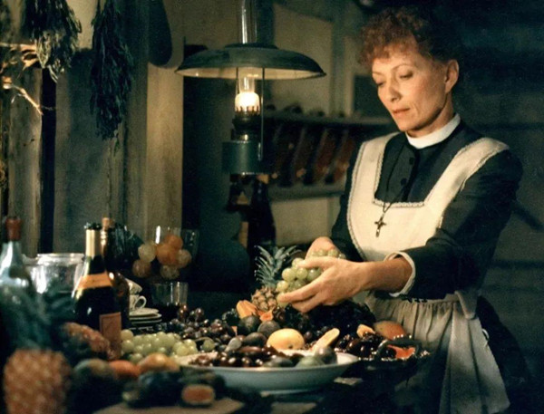 肉体与灵魂,这对西方宗教与哲学中被讨论得最多的对立二元。电影《巴贝特之宴》中马蒂娜曾经的追求者洛伦斯是这种肉体、灵魂分立的践行者,晚宴结束跟马蒂娜告别时,他说自己从青年时代第一次在小镇上见到马蒂娜起,在他灵魂的世界中,他已经每天跟马蒂娜生活在一起;而他的肉体却跟女王的侍臣结婚生子,享尽世间荣华富贵。洛伦斯的这份深情告白却没有让人觉得他虚伪,因为他本人确实表现得笃信这灵魂与肉体分立的双重世界,并且他在两个世界之间游刃有余。洛伦斯跟清教徒们不同,从来不掩饰自己对两个世界的追求,正如他在餐桌上对所有巴贝特精心准备的食物和美酒如实地赞不绝口;反而是清教徒们,明明被美食和美酒所触动,却还要顾左右而言他,真诚坦率和虚伪分裂,让人们一目了然。《巴贝特之宴》正是要用人们掩饰不住的对美食的热爱,来对极端压制肉体感官的做法进行嘲讽和批驳。