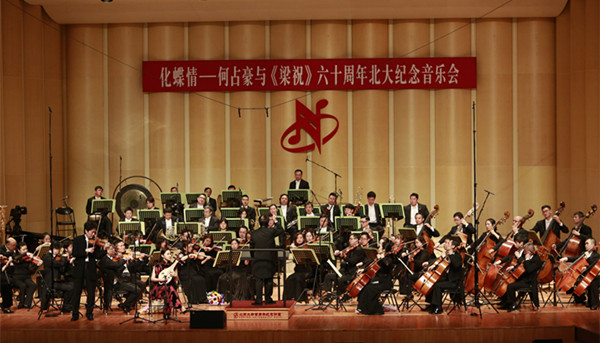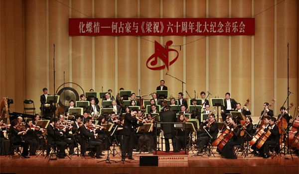 随后,何占豪指挥中国国家交响乐团,与禹洁共同演奏柳琴版《梁祝》,让大家在聆听乐曲中进一步领略《梁祝》的音乐语汇与艺术魅力。何占豪先生今年已86岁,但精神矍铄,指挥充满激情。毕业于北大并留校任职的禹洁具有专业的柳琴演奏水准,她娴熟的手法中蕴含了饱满的情感,并随着故事的发展而演奏不同的音色,悠扬婉转,丝丝入扣,这是首度面世的柳琴版本,也是独一无二的北大版本,给观众带来耳目一新、别具一格之感。