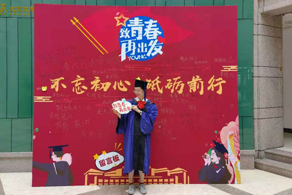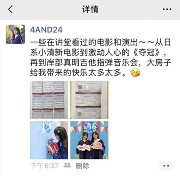 “时光荏苒,转眼就要离开这个满载了回忆的园子了,走进讲堂的时候不禁想起了在这里看过的一场场演出和电影,这些闪闪发光的回忆将陪伴我走过未来的漫长岁月。毕业快乐,后会有期!”