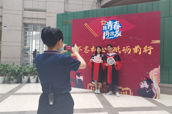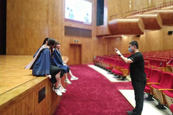 7月6日至15日,讲堂推出毕业生“拍照打卡大房子”活动。在6天12场次的活动中,500余名毕业生报名走进讲堂留影。讲堂为同学们精心设计制作了留言板和手举牌,设置专人进行引导,并帮助同学拍照。同学们在四季庭院、观众厅、纪念大厅等地,拍摄合影、录制视频,将毕业的喜悦和离开校园的不舍定格在“大房子”,留下美好的身影与回忆。