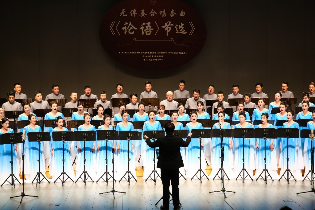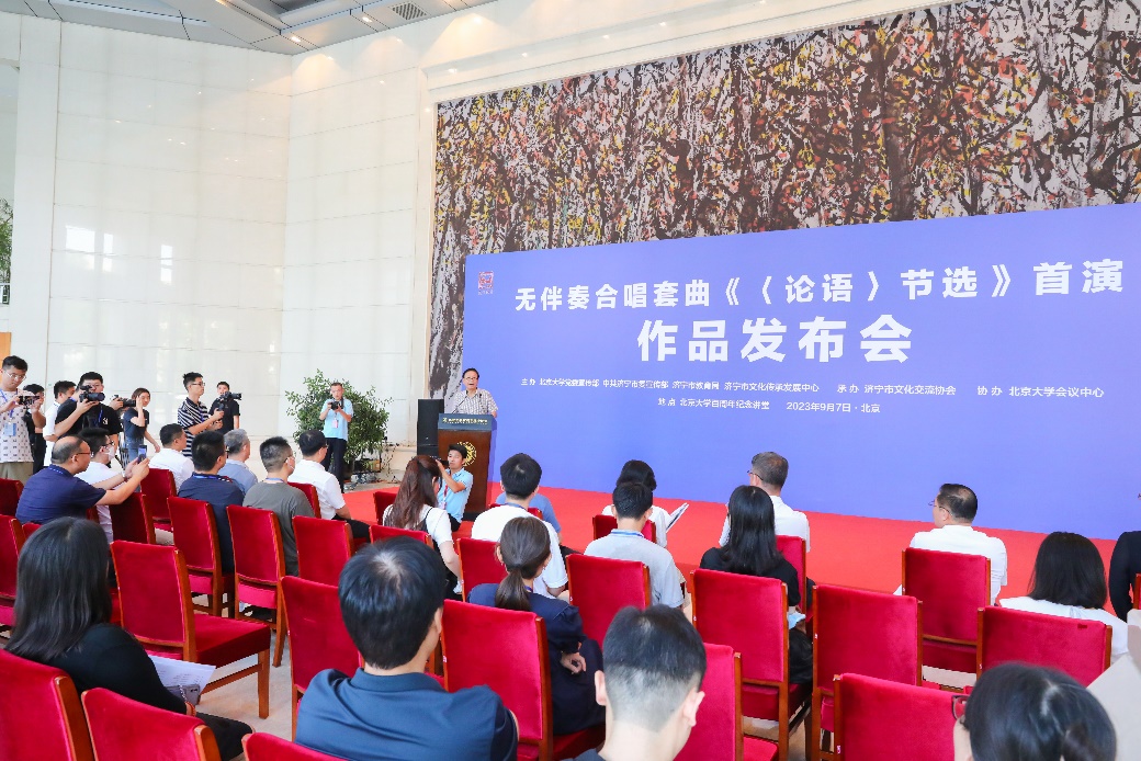无伴奏合唱套曲《〈论语〉节选》是中国第一部以《论语》经典名句为演唱内容的无伴奏合唱套曲,以孔子“仁爱”思想为提挈,共分仁爱、民本、诚信、正义、师道、政德、和合、大同八个篇章,并辅以序和尾声。作品由孔子研究院原院长杨朝明对内容进行编审、首都师范大学教授尹铁良作曲、济宁仁之声教师合唱团演唱。9月7日下午,无伴奏合唱套曲《〈论语〉节选》作品发布会在百周年纪念讲堂大厅举行。北京大学党委宣传部副部长于晓凤,济宁市委宣传部领导,以及人民日报社、新华社、中央广播电视总台等20家媒体出席。发布会由济宁市委宣传部副部长、市新闻办主任王磊主持。