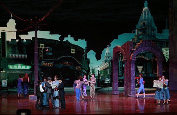 此外,灯光舞美的设计也为全剧增色不少。在《爱的涟漪》一曲中,灯光由白转粉,暗示聂耳和小莉的爱情逐步升温,最终心心相印,海誓山盟。演出还灵活结合影视艺术,更全面地展现上海的都市风情和抗战的历史烟云。全剧开头以短片的播放引入,具有代入感,又巧妙完成剧幕间的过渡衔接。演员的服装和舞台背景的设置也可圈可点,尤其是多条抗日标语垂直悬挂于舞台上方的创意,给观众以直接的视觉冲击。