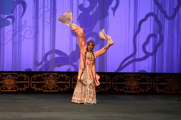炉火纯青的水袖功夫更是让场下观众赞叹不绝,外化人物心理的同时也带来一种别样的审美体验。在《发水》一场戏中,快速抖动、上下飘摇的水袖,仿佛波涛袭来,洪水汹涌,生动再现了湘灵面临洪水,苦苦挣扎,极力躲避的状态。又如在《寻球》一场戏中,湘灵听到“球上楼了”,彼时只见她起云手,转身,反水袖,两臂撑开,下蹲后亮相。这一反一撑一蹲的表演,连贯表现出内心的惊讶,使得整个身段十分圆满。