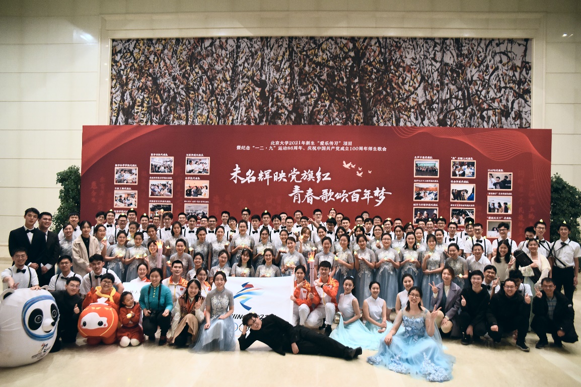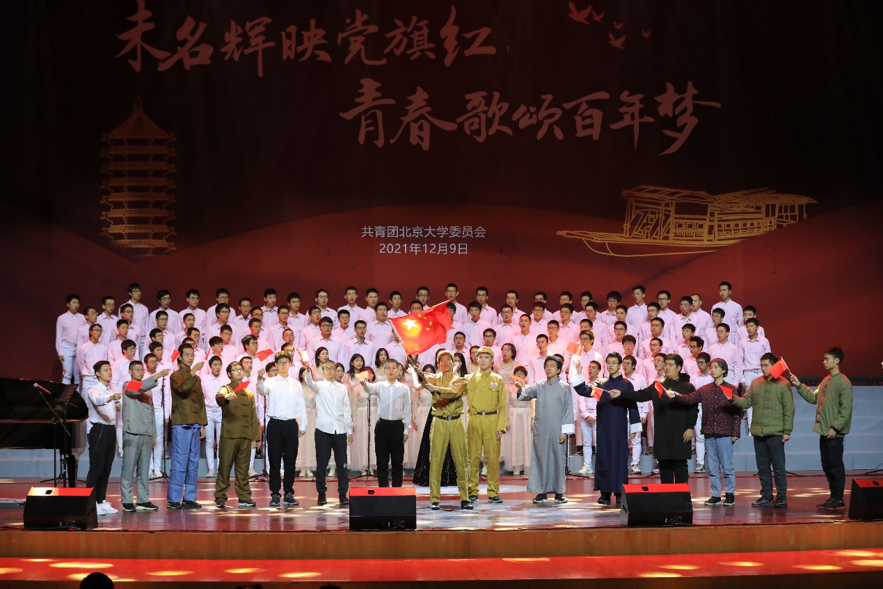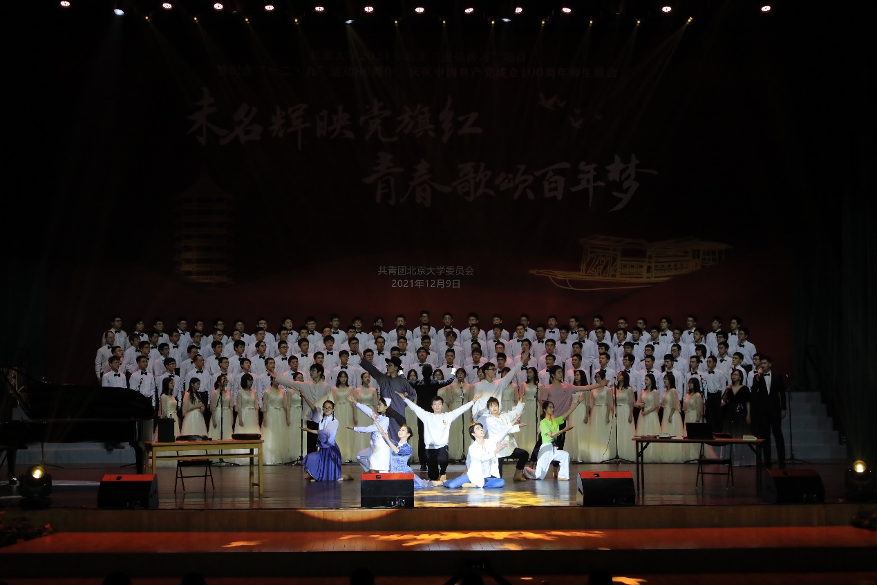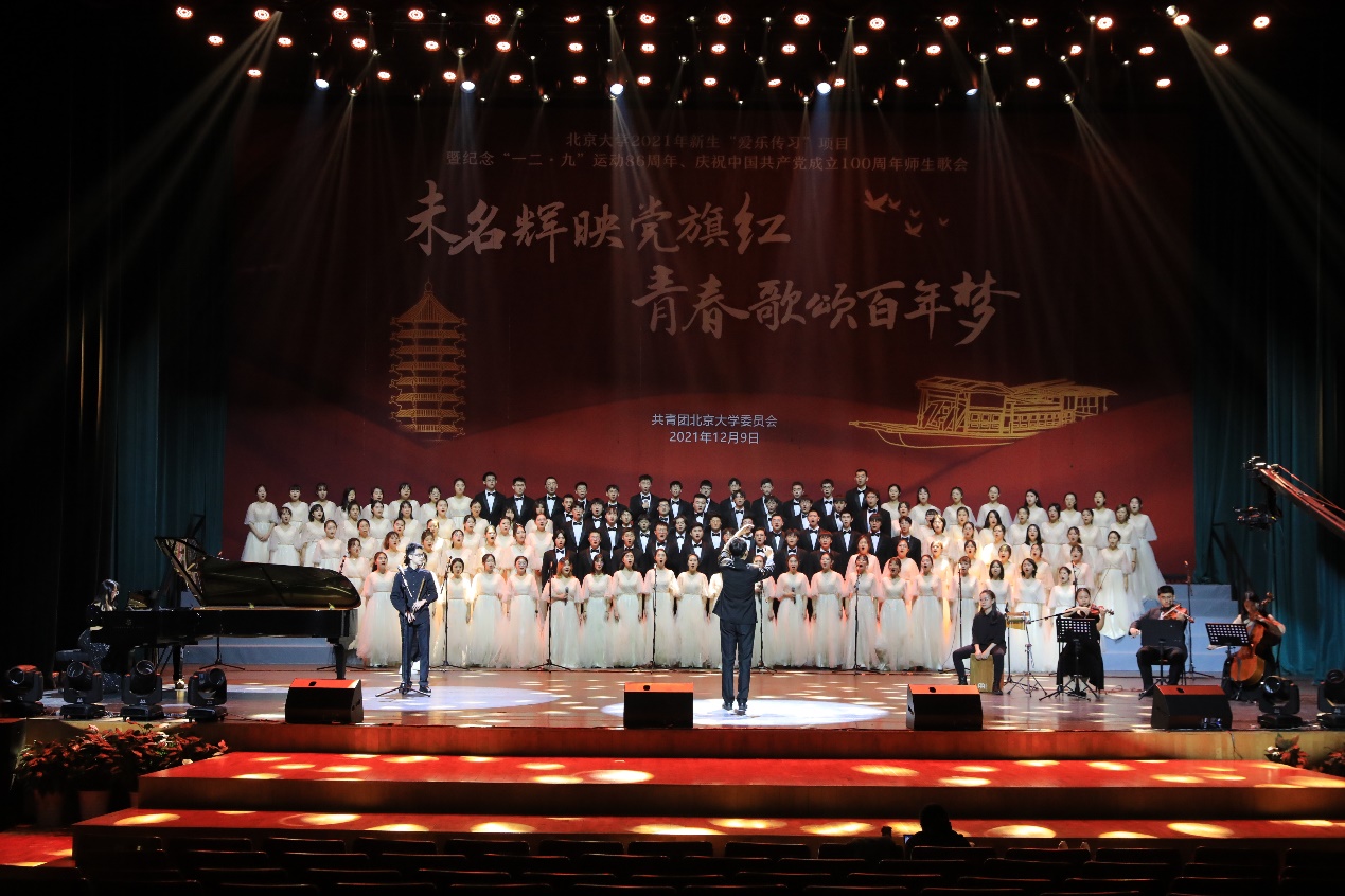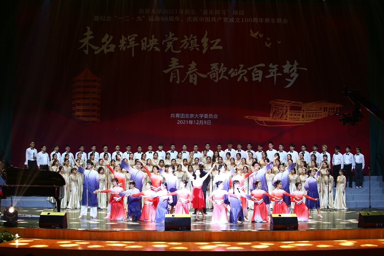 北京大学连续多年举办“一二·九”师生歌会,数十年间引领北大青年在歌声中追思峥嵘岁月,在传习中思考时代主题,将爱国主义教育和集体主义教育融入到声乐美育教育中,年复一年,重温革命先辈为实现民族独立和解放而奋勇前进的革命历程,赓续“团结起来,振兴中华”和“请党放心,强国有我”的青年使命。本届纪念“一二·九”运动86周年、庆祝中国共产党成立100周年师生歌会的主题是“未名辉映党旗红,青春歌颂百年梦”,由28个院系师生组成的22支代表队经历了两个多月的集体排练,倾情演绎,呈现出较高的艺术水准。