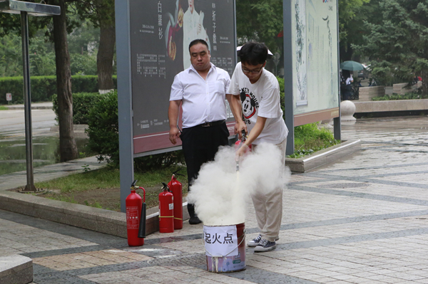 学生志愿者进行灭火器操作实践
