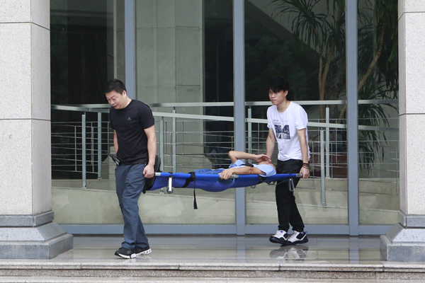此时,讲堂屋顶模拟烟雾已升起。讲堂消防员立刻由纪念大厅接好消防水龙带,向南广场方向甩放铺设,动作迅捷地接好喷头。四位消防员分成两组,一人握紧喷头,一人扶稳水龙带,两注水柱对准起火点进行喷淋扑救。在持续数分钟后,火势得到有效控制。在现场检查无明火后,消防管理人立即指挥救护组人员检查有无被困人员及伤情状况。两名消防保障员利用担架将被困人员救出,转移至安全地带并呼叫救护车等待进一步救援。最后,火灾扑救人员集合,等待火灾调查,至此扑救实操环节完成。