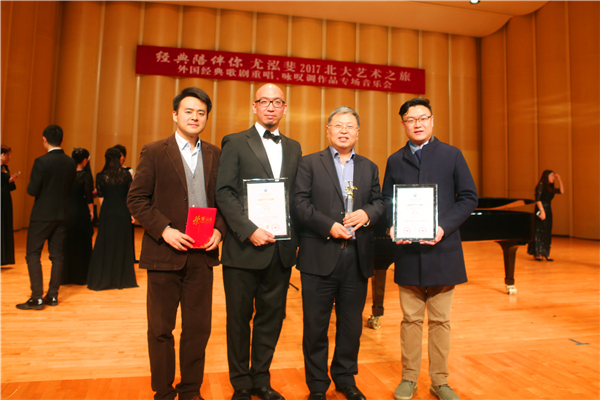 值得一提的是,在当晚的演出中,百周年纪念讲堂室内合唱团成员首次与艺术家合作登台,在观众厅大舞台献唱多首经典曲目,获得了专业艺术家与广大观众的认可和赞誉。讲堂室内合唱团自2015年成立以来,致力于打造国内一流高校艺术中心的一流演出团体,推广合唱艺术,助力艺术教育。尤泓斐老师作为讲堂室内合唱团的特邀艺术指导,通过悉心的专业指导和多年的舞台经验传授,使团员们的声乐水平和舞台表现能力都得到了较大提升。合唱团今年秋季在由北京文化艺术活动中心、北京音乐家协会主办的2017首都市民系列文化活动“歌唱北京”比赛中,以专业的水平和稳定的表现获得评委观众一致认可,在11月11日获颁小合唱组混声合唱金奖、男声合唱银奖,中青年组金奖三项大奖。