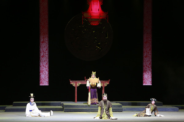 此外,两名如影子般的舞者,也为《红珠记》增添了一抹亮色。在前景处主剧情不断推进的同时,在背景处两名舞者总适时出现,他们时而舒展时而卷曲、时而外放时而内敛、时而激烈时而隐忍的舞蹈语汇,仿佛成了剧中人物心灵的外化,对营造氛围、渲染情绪多有助益。这称得上传统戏剧与现代舞蹈融合的一种创新尝试,是古今贯通、东西结合的一种有益探索,为吸引更多年青观众接受和喜爱传统戏剧开辟了新路。