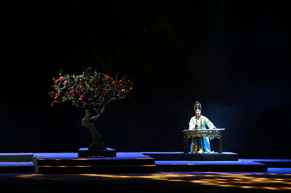 《红珠记》由《还珠定情》《惊变选秀》《迎亲赠珠》《游龙戏凤》《贵妃省亲》《夺情赐婚》《大梦归天》七个场景组成,以一串红珠为线索串联起两个爱情悲剧,明线与暗线彼此交错、环环相扣,最终红珠散落,皆化作音符,奏响人间别离的笙箫。