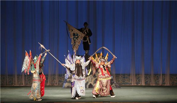在这部经典“男人戏”中,精彩的武戏让人大饱眼福。“火烧连营”一折,陆逊火烧连营,刘备败走,张建峰甩髯口、吊毛、抢背的技巧表现逃亡的慌张与窘迫,显得利落干脆、功力稳健。扮演赵子龙的著名京剧表演艺术家奚中路出场,打开阵势,英武神勇,迎来台下叫好连连。吴国众将围追、马童翻跃、子龙救主,一段“打快枪”加上“扫头”,最后关头把韩当挑落下马,精湛的表演赢来满场热烈的掌声。