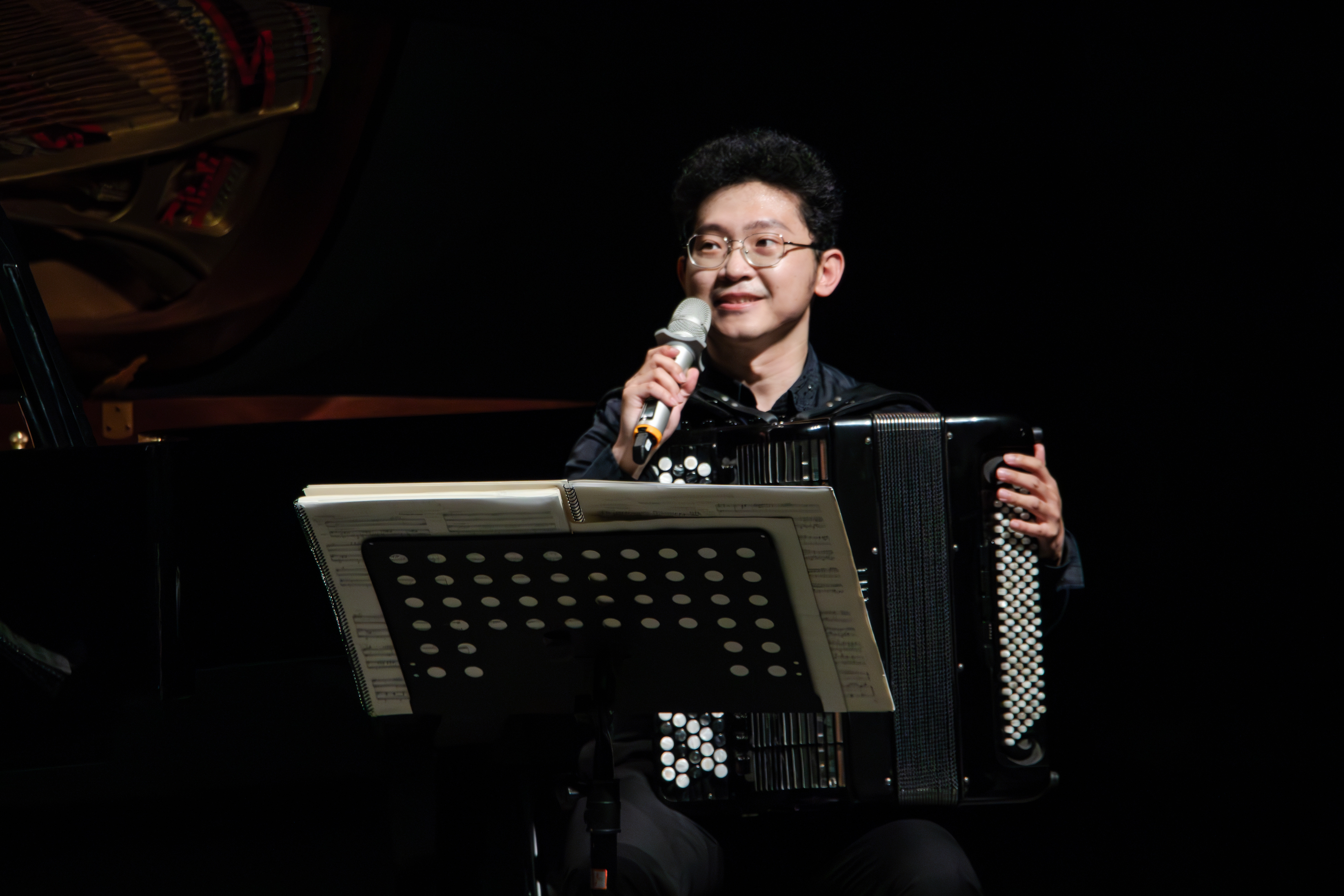 本次音乐会在盖德的《嫉妒探戈》中拉开帷幕,许笑男的手风琴与许歌卉的钢琴相互交织,旋律激昂又深情,兼顾了欧洲的典雅与吉普赛的热情,瞬间点燃了整个音乐厅的气氛。许笑男在曲间为观众介绍乐器特色、曲目背景及探戈故事,让观众在音乐欣赏之余了解更多艺术知识。