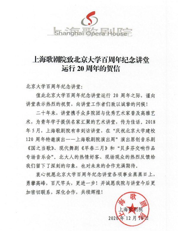 2020年适逢北京大学百周年纪念讲堂运行20周年,二十年来,讲堂与众多艺术家和艺术团体携手,打造出“高雅艺术殿堂”和“素质教育课堂”的双重品牌。
