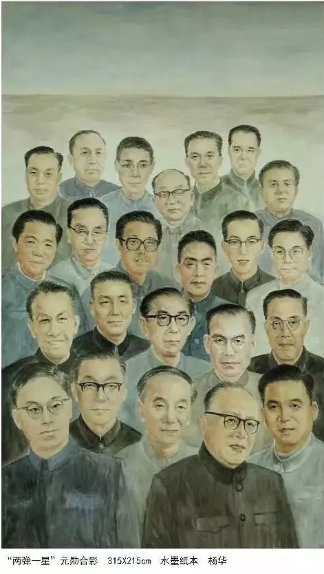 本次画展的亮点之一是展厅入口处一幅以艺术形式呈现的23位“两弹一星”功勋们的“大合影”元勋们没有一张合影,杨华创新地将23位人物的肖像画在了一起。