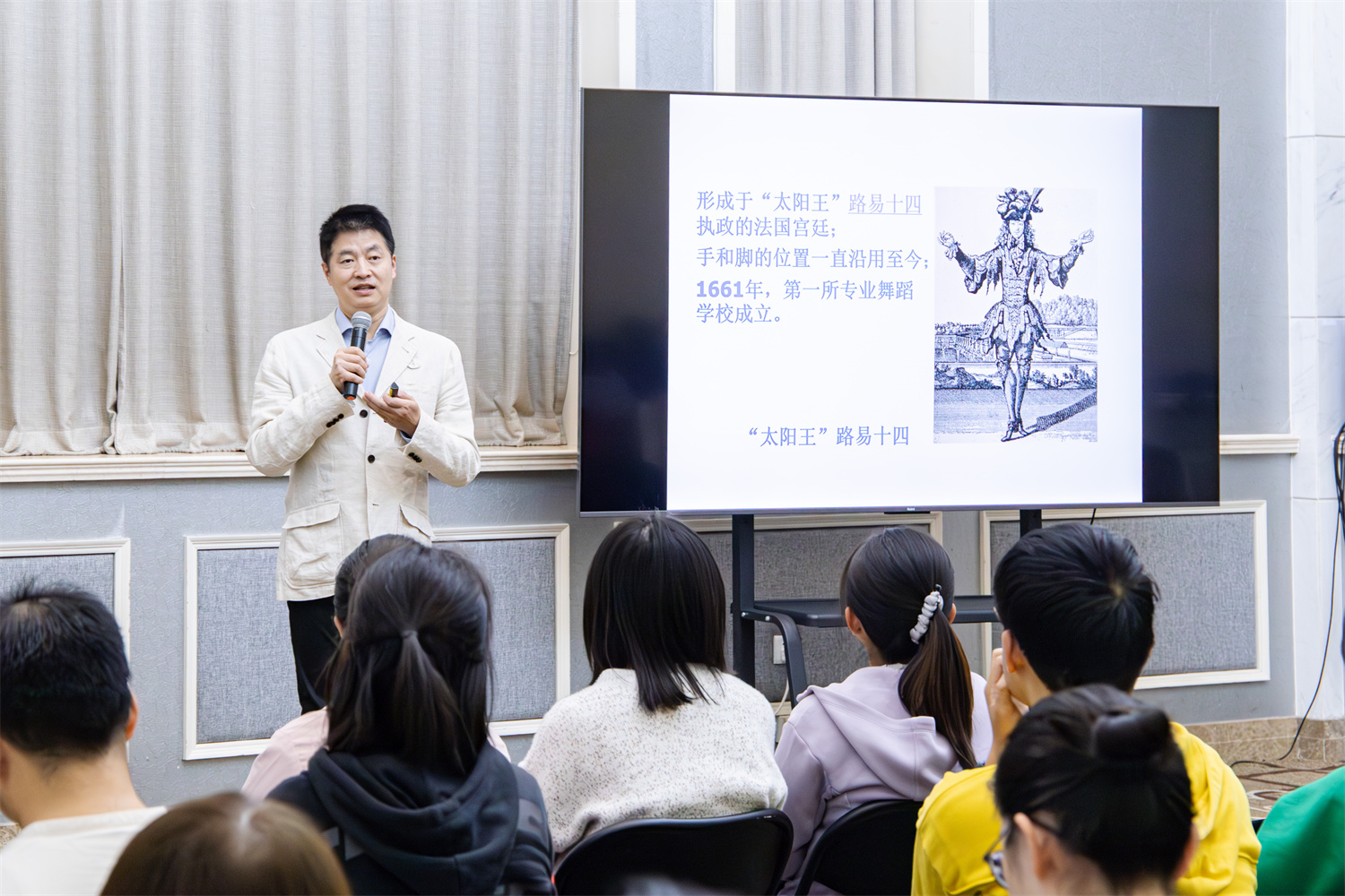 为增进同学们对芭蕾艺术的了解,10月10日晚,讲堂还特别邀请了中央芭蕾舞团芭蕾大师徐刚,在讲堂202会议室举办了“国际学生学者美育基地艺术课堂足尖上的华彩——芭蕾舞导赏讲座”。讲座采用了讲、演、视频相结合的形式进行,详细讲解了芭蕾舞的起源、欣赏方法以及中央芭蕾舞团的主要作品,还在互动过程中与现场同学们共同探讨了芭蕾艺术的相关话题。