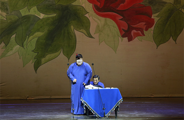 青年相声演员冯巍、万宇为观众奉上另一种传统曲艺表演——双簧。两人先以幽默语言介绍了双簧的起源与发展,而后醒木一拍,表演正式开始。万宇为前脸,端坐桌前,在“头戴冲天辫子、脸抹三块白粉”的装扮下,愈显呆萌可爱摇曳多姿;冯巍为后脸,藏于椅后,尽现说学逗唱之功底。两人配合默契,在一系列有意设定的破绽、失误、错位中,产生了让人意想不到的喜剧效果。