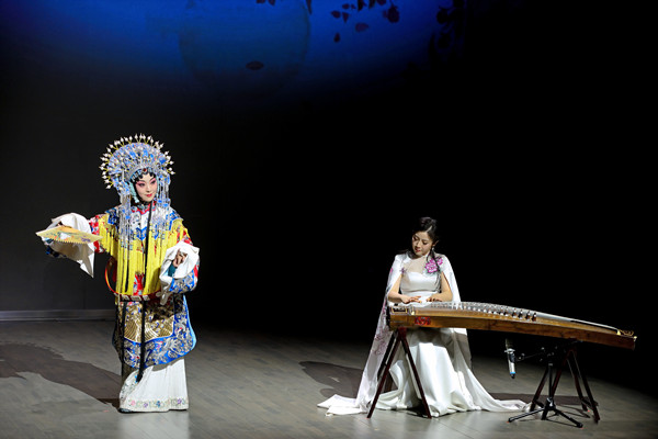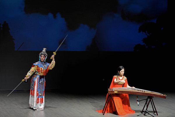 尚靖雅用自作曲的筝曲《巾帼英雄》拉开了演出的序幕。刚柔并济的筝声伴着青衣郑潇精彩的演唱,意蕴深刻,回味无穷。紧接着是筝曲《春日景和》,这本是著名的京剧曲牌,尚靖雅对其进行了改编。乐曲节奏由舒缓而不断加快,直至高昂,尚靖雅仿佛拨动出春天生命破土、拔节的声音,充满活力的乐声感染了每一个观众。随后上演了《贵妃醉酒》(“海岛冰轮”选段)和《醉·百花亭》。《贵妃醉酒》是梅兰芳毕生雕琢的经典代表剧目,这首古筝伴唱作品保留了原汁原味的唱腔和京胡音乐,辅以古筝伴奏,别有韵味。《醉·百花亭》是由尚靖雅根据其构思,特别委约作曲家方健创作的。其曲运用了京剧《贵妃醉酒》“海岛冰轮”这一乐句,作为全曲发展动机,创作而成。在古筝伴奏下,郑潇用不紧不慢、委婉细致的唱腔塑造了哀怨自伤的杨贵妃形象。筝声、箫声、唱腔三者交融,层层递进,展现出杨贵妃从微醺到大醉的过程;现场观众也都沉浸在乐曲中,如痴如醉。