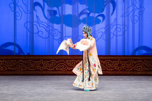 炉火纯青的水袖功夫更是让场下观众赞叹不绝,在几场考验身段功夫的戏中,迟小秋水袖表演缓急有度、一气呵成。如在《发水》一场戏中,快速抖动、上下飘摇的水袖,仿佛波涛袭来,洪水汹涌,生动再现了湘灵面临洪水,苦苦挣扎,极力躲避的状态。又如在《寻球》一场戏中,湘灵听到“球上楼了”,彼时只见她起云手,转身,反水袖,两臂撑开,下蹲后亮相。这一反一撑一蹲的表演,连贯表现出内心的惊讶,使得整个身段十分圆满。