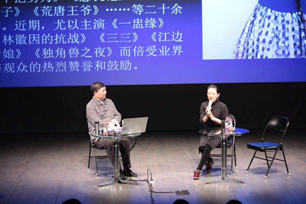随后,张弘老师请上了著名编剧罗周老师,并在简短的介绍之后为观众放映了《一盅缘》中感人至深的林六娘叩庙叩至第十庙的段落。罗周老师在交流中分享了许多创作中的小故事,如改编过程中对于林六娘绣幡与叩庙行为的取舍,“现在站在这个原点上回看,当然会选择叩庙,用山势的起伏表现情感的起伏,用庙宇的变化表现情感的变化,还有很多舞台呈现的原因,但是当年改编时打动我的就是重山横亘成一条线,林六娘就是小小的一个点的那个场景”,罗周老师如是说。同时,罗周老师还坦率地讲述了自己的情感经历对于自己创作的影响,结合《一盅缘》中两位主角“一盅香茗定情”的场面,生动而满溢才情的语言表达让我们看到了一位灵魂丰盛的编剧老师。罗周老师也为我们分享了文本艺术与舞台艺术表达方面的诸多不同以及自身的思考,她表示,《一盅缘》的剧情比较简单,这就给了舞台表达更多的空间。罗周老师也会思考,随着自己创作岁月的累积,是否会出现技巧变多、感情变钝的情况,创作的作品会有怎样的变化。